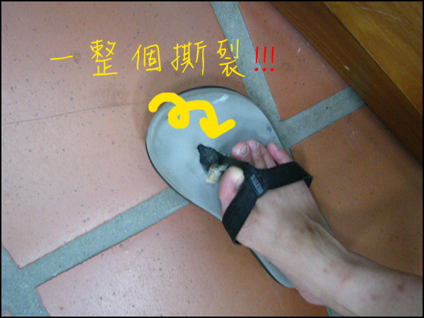 拖鞋活生生的破了,腳指夾住的位置跟鞋底脫離了